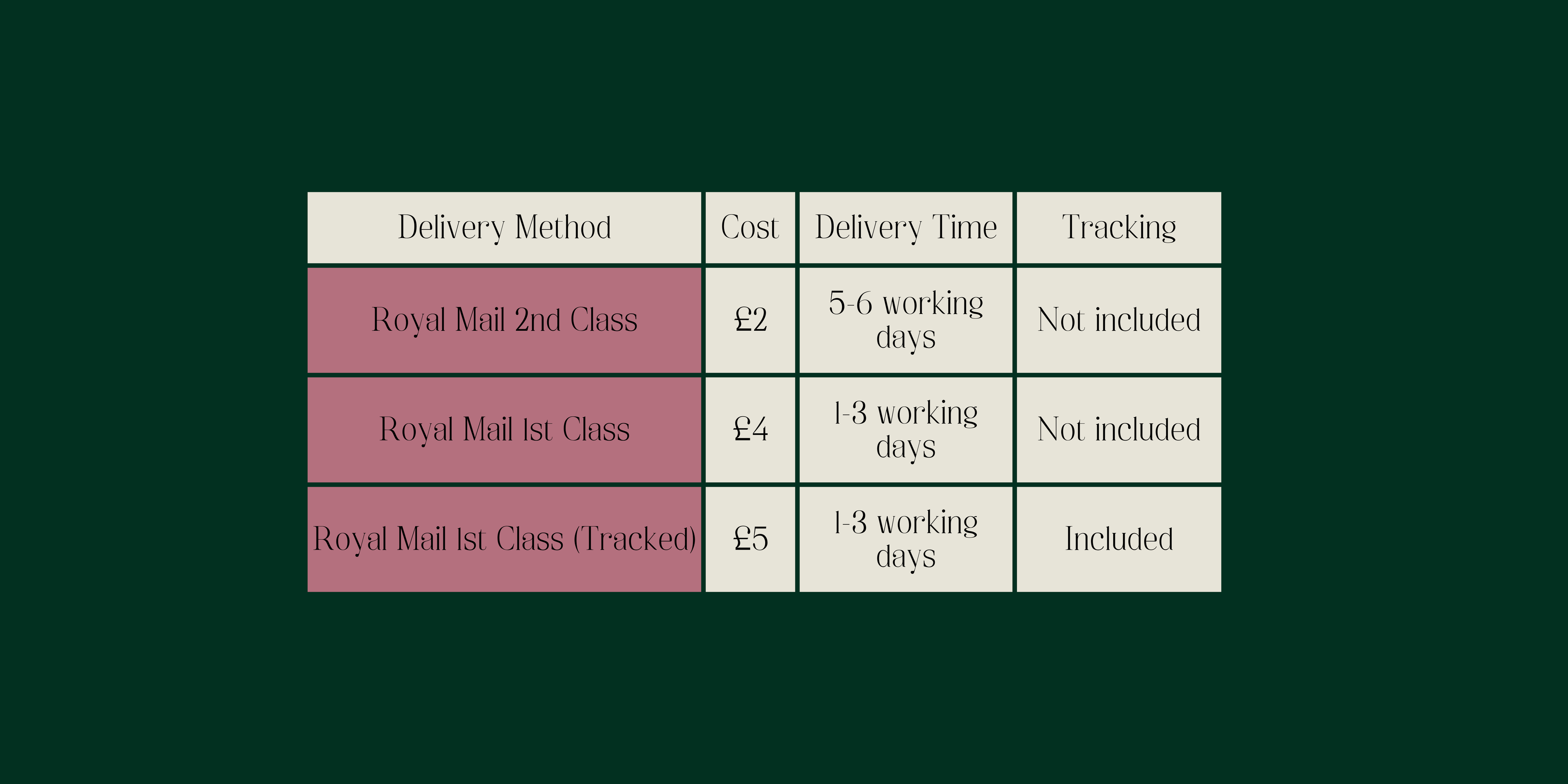- We ship all orders using Royal Mail, with both 1st and 2nd Class delivery options available.