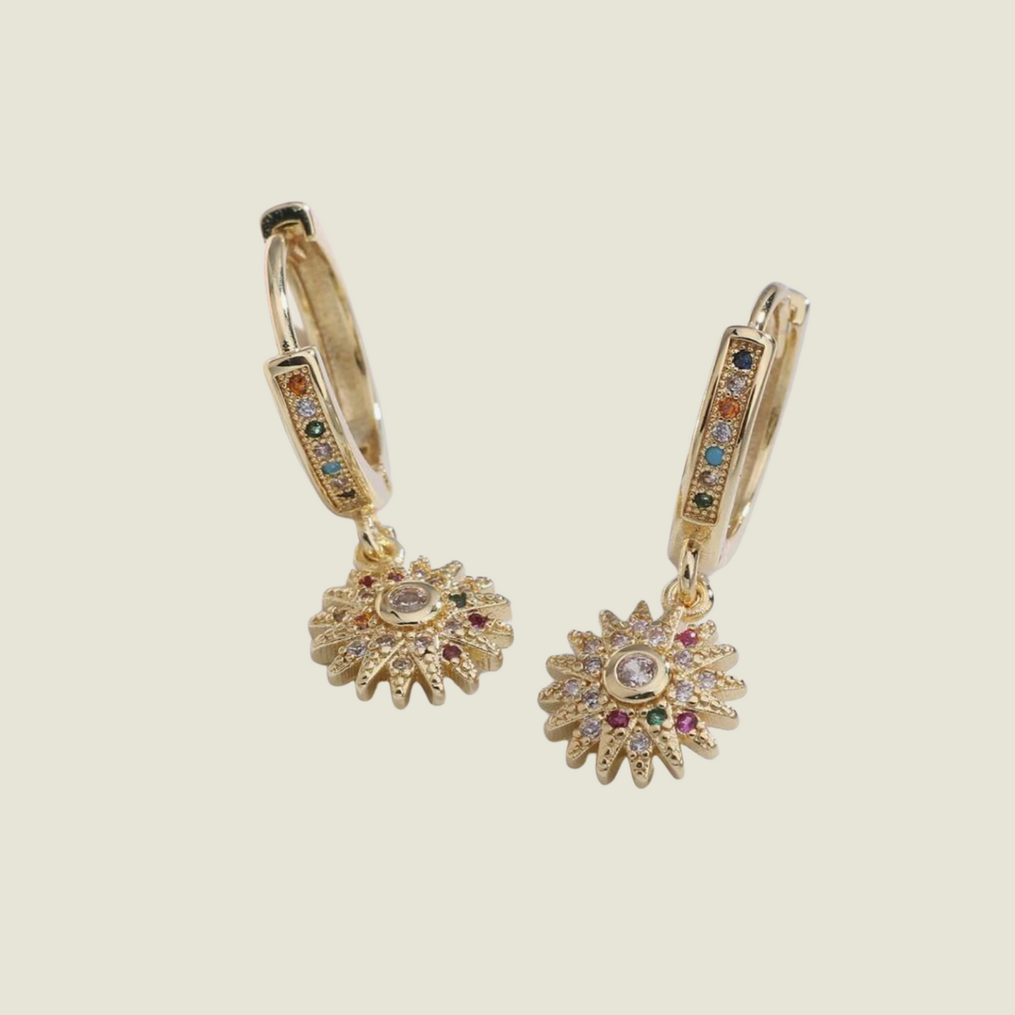 Radiate confidence and brilliance with our Glow Earrings, a dazzling celebration of light and colour. These gold-tone hoops feature intricate multicoloured gemstones that shimmer with every movement, paired with stunning sunburst-inspired pendants that exude warmth and vibrancy.